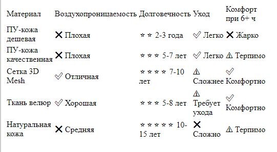 Для кого подходит: студенты, геймеры с игровыми сессиями до 3-4 часов, пользователи, которым важен внешний вид при ограниченном бюджете. Срок службы при аккуратном использовании — 2-3 года. Главные риски: проседание пены через 1-2 года, растрескивание ПУ-кожи, износ механизма наклона.